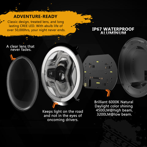 • Unique Design: Exclusive Patent, the JL headlights with white beam + red background light+logo light as DRL; white beam + red background light + yellow beam as turn signal, it is the new design to giving your vehicle a sleek look. You will get sequential welcome light when you firstly turn on the DRL.